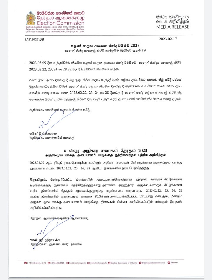 உள்ளூராட்சி தேர்தலுக்கான தபால் மூல வாக்கெடுப்பு மறு அறிவித்தல் வரை ஒத்திவைக்கப்பட்டுள்ளதாக தேர்தல் ஆணைக்குழு உத்தியோகபூர்வமாக அறிவித்துள்ளது.