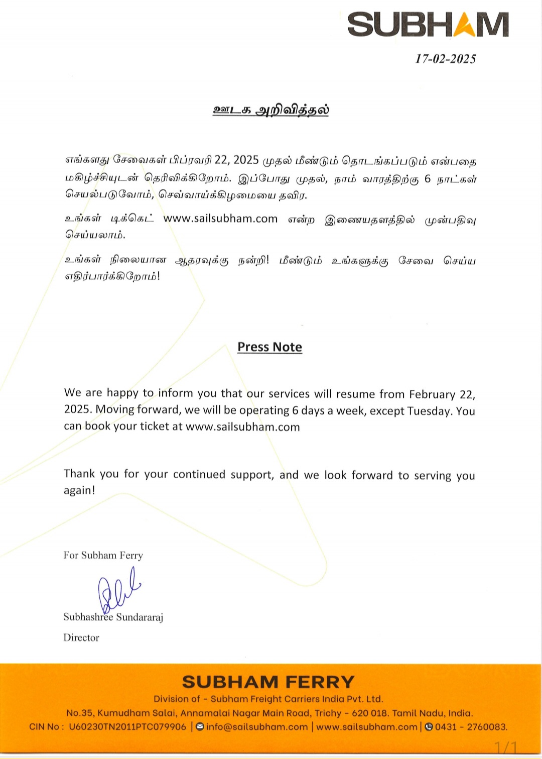 காங்கேசன்துறை - நாகப்பட்டினம் இடையிலான பயணிகள் போக்குவரத்து கப்பல் சேவையானது எதிர்வரும் 22.02.2025 மீண்டும் ஆரம்பிக்கப்படவுள்ளதாக சிவகங்கை கப்பல் சேவை நிறுவனத்தின் தலைவர் சுந்தரராஜ்... [ மேலும் படிக்க ]